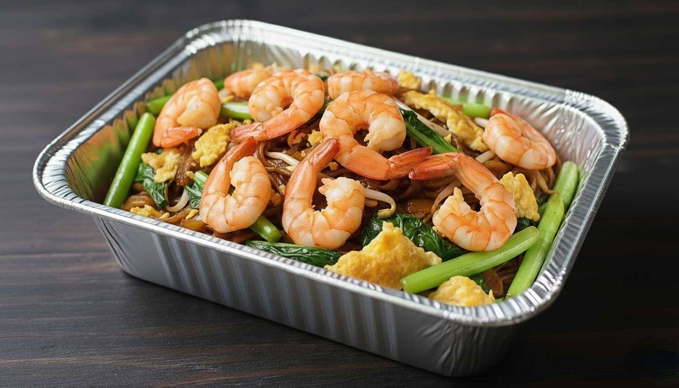 Flat rice noodles stir-fried with succulent shrimp, savory fish cake, and bound together with scrambled egg, crunchy bean sprouts, and fragrant garlic chives. Tossed in a savory-sweet dark soy sauce, this Penang classic delivers an irresistible smoky flavor in every bite.