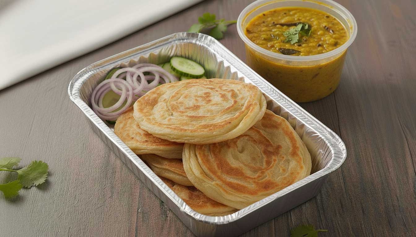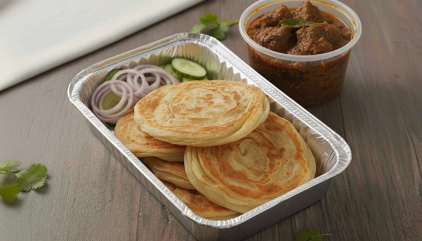 Crisp, flaky Indian flatbreads accompany slow-cooked beef rendang. The beef simmers in rich coconut milk and aromatic spices until it becomes tender. Paired with spicy sambal and comforting lentil dhal, this Malaysian favorite is perfect for dipping and sharing.